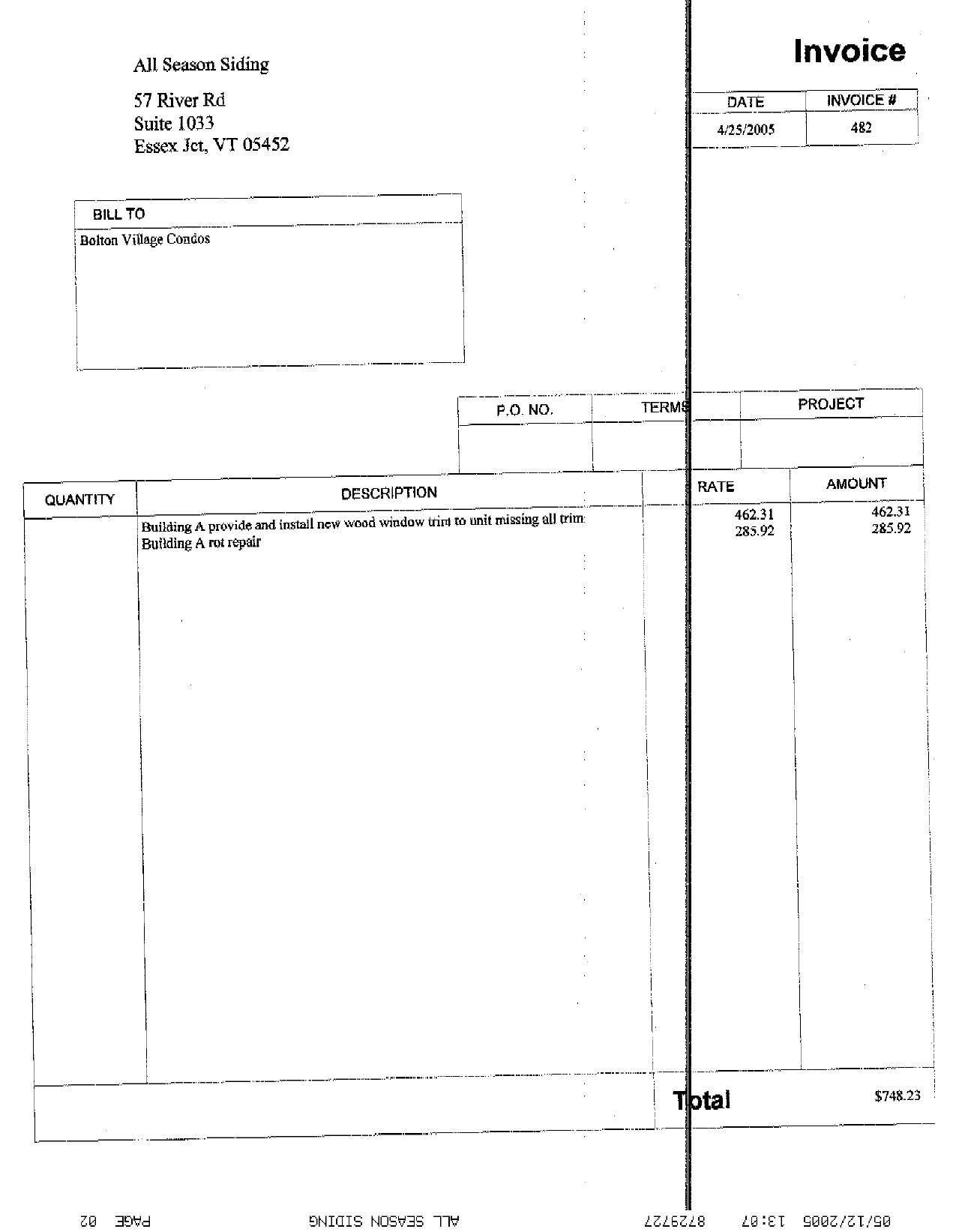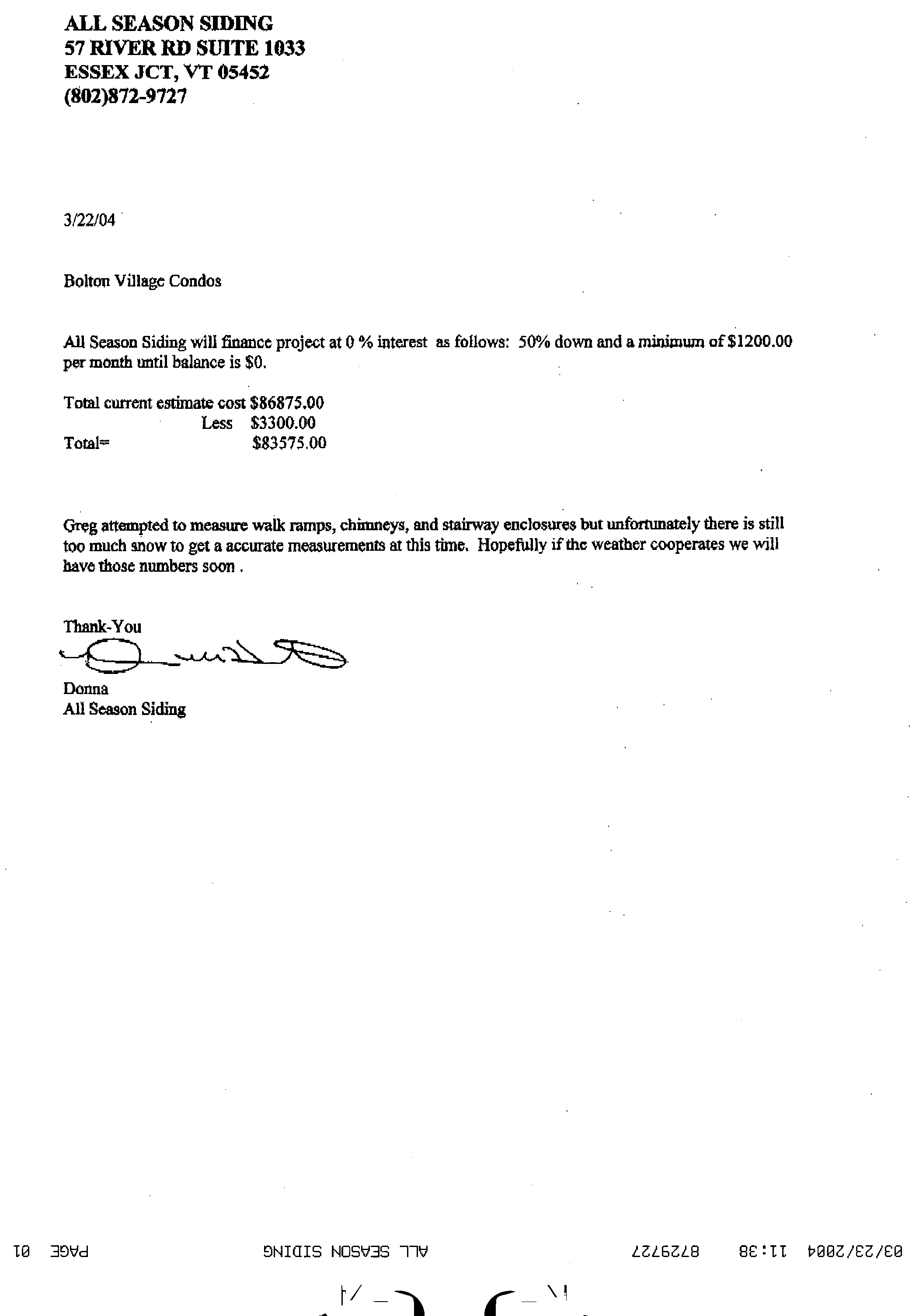 Folks, Donna of All Season Siding is faxing a quote to me by tomorrow