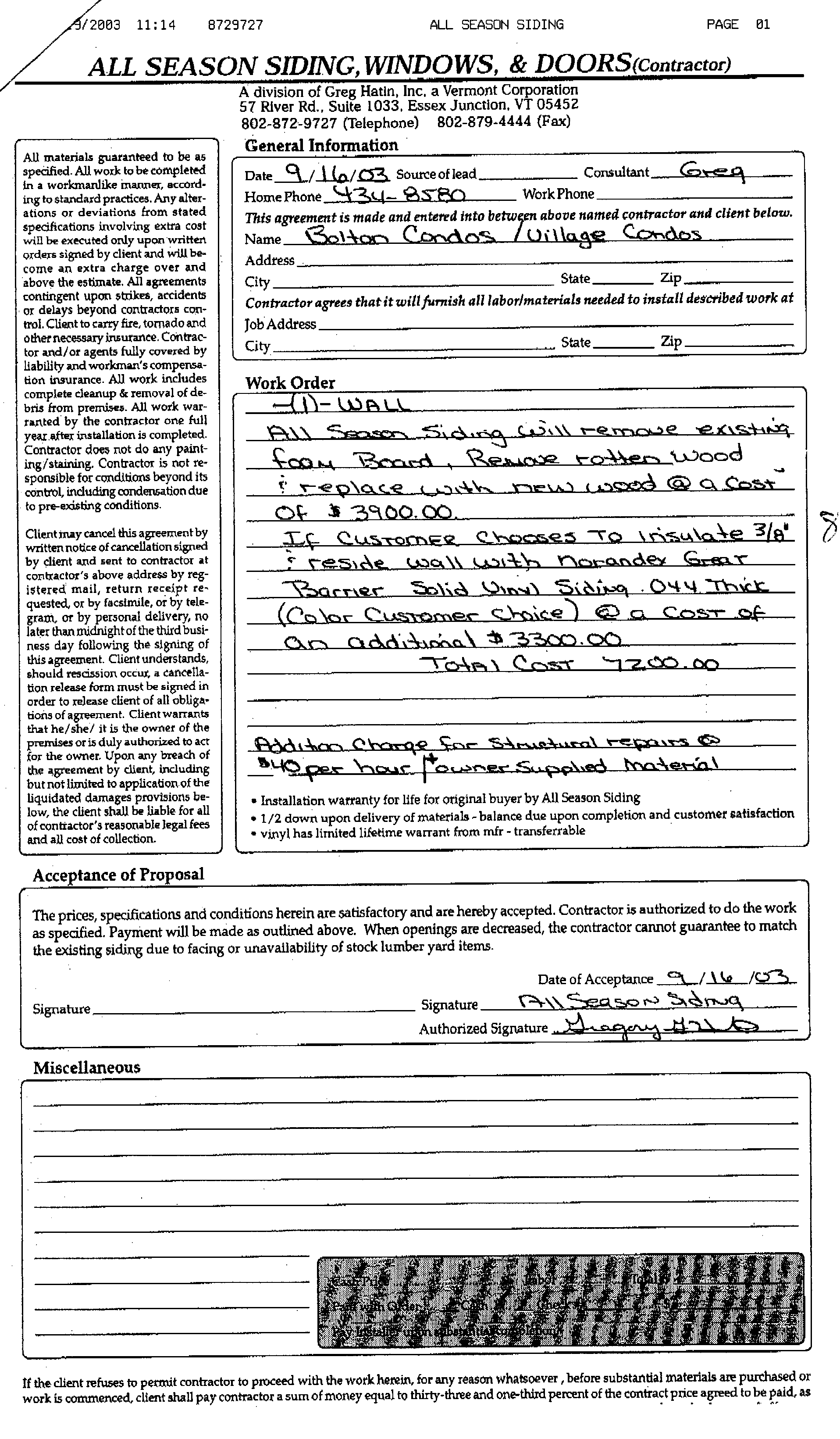 The following is information was transcribed from a fax sent by Greg of "All Season Siding, Windows and Doors", Dated 08/18/03: