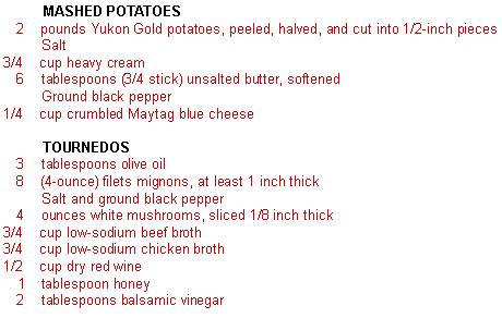 from Restaurant Favorites at Home Beef Tournedos with Blue Cheese Mashed Potatoes Serves 4 It’s important to use
